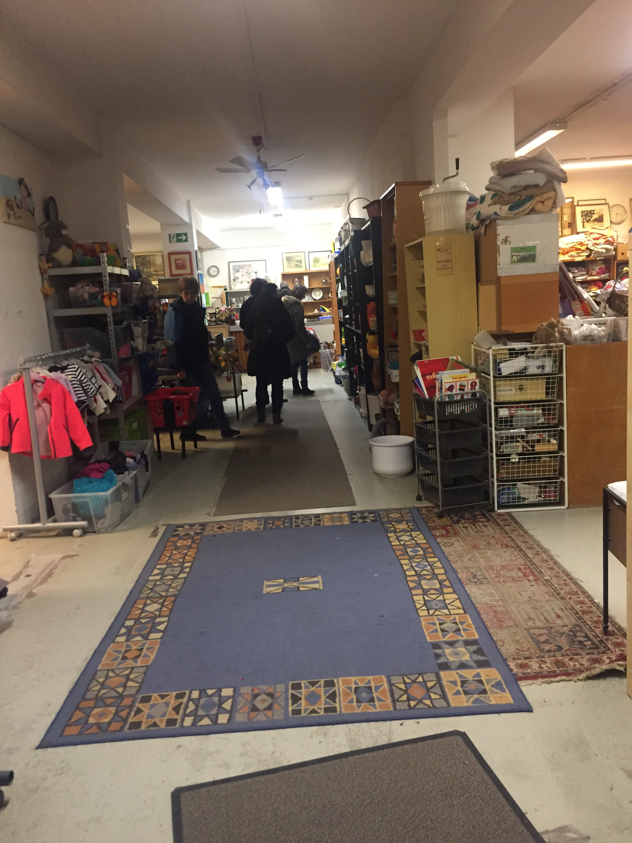 Zwei Etagen in einem Industriegebäude beherbergen den Rumpelbasar. Im Untergeschoss sind zwei Herren für Bücher, Elektro und Kleinmöbel zuständig, oben verwalten ein paar energische Damen die Abteilung Textil, weitere Kolleginnen zum Teil reiferen Alters sind mit weißen Baumwollhandschuhen (!) in der Geschirr- und Haushaltsabteilung tätig, jüngere Freiwillige übernehmen das Abkassieren der Spielwaren und Kinderkleidung.
