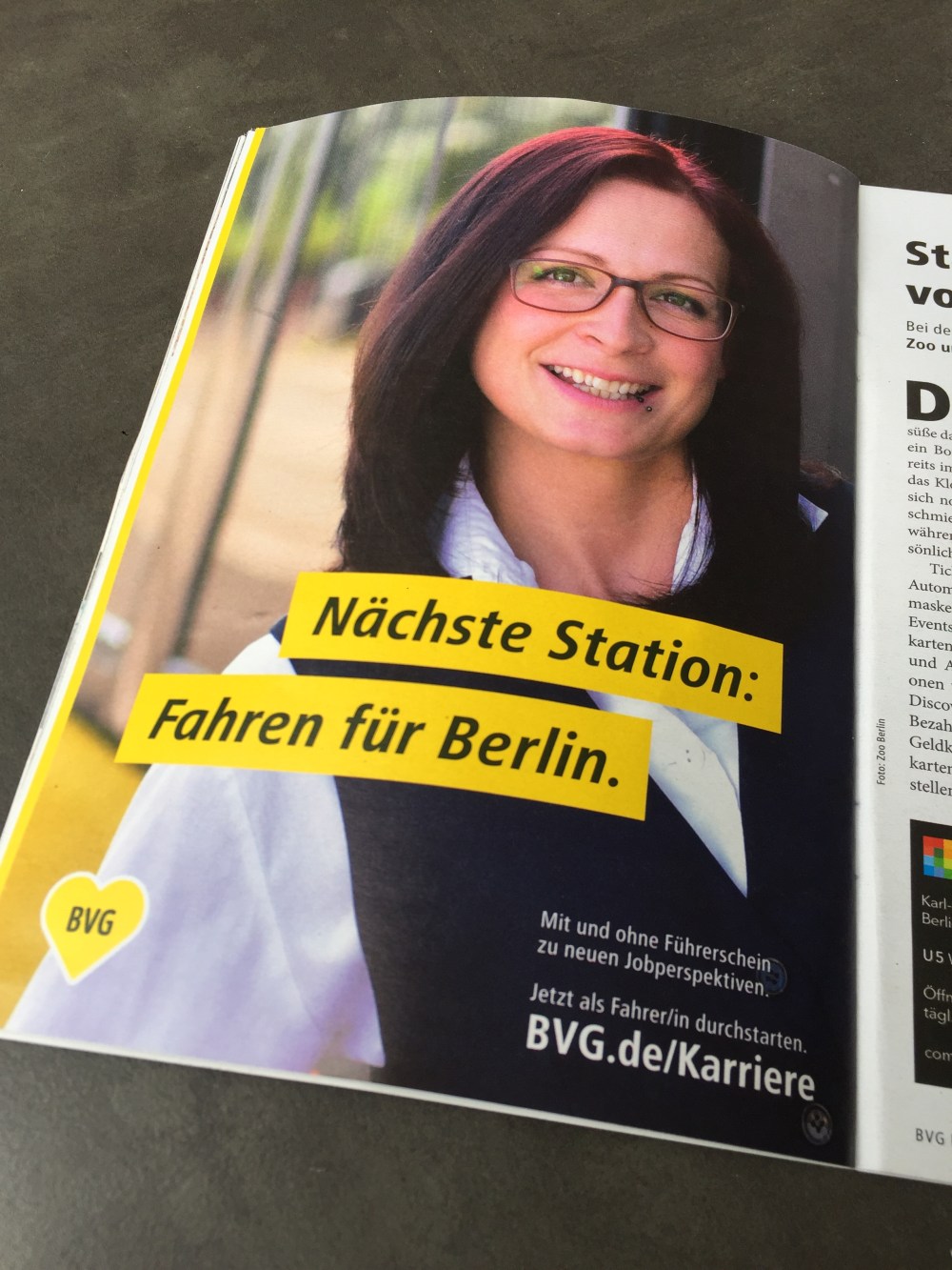 Die Berliner Verkehrsbetriebe BVG haben sich ein knallgelbes Herz als Logo ausgesucht, so gelb wie ihre Busse und Bahnen („Verkehrsgelb“ RAL 1023). Unter dem markanten Herz steht der charmante Gruß „Weil wir dich lieben“. Also ich, der Fahrgast, werde geliebt von einem öffentlich rechtlichen Betrieb. Können Sie sich irgendeine andere deutsche Stadt als Berlin vorstellen, die sich mit einer solch emotionalisierenden Botschaft an die Allgemeinheit wendet?