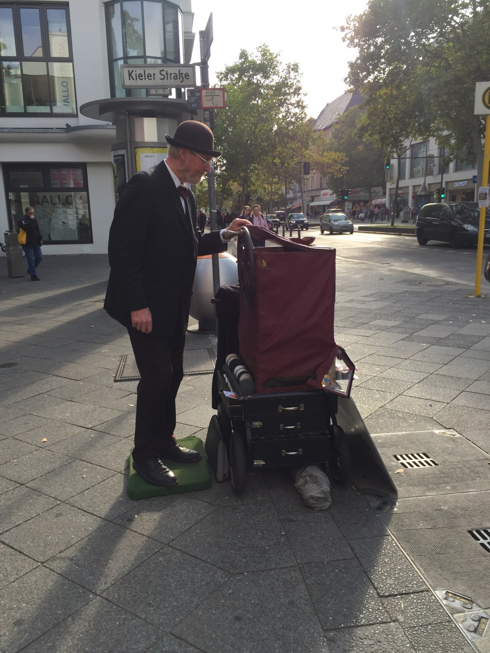 Von wegen immer dieselbe Leier! Der Leierkastenmann in der Schloßstraße führt auf einem kleinen Zettel Buch über alle am Tage des Auftritts „runtergekurbelten“ Melodien und vermeidet tunlichst jede unnötige Wiederholung seiner eigenen Liebhaberstücke.