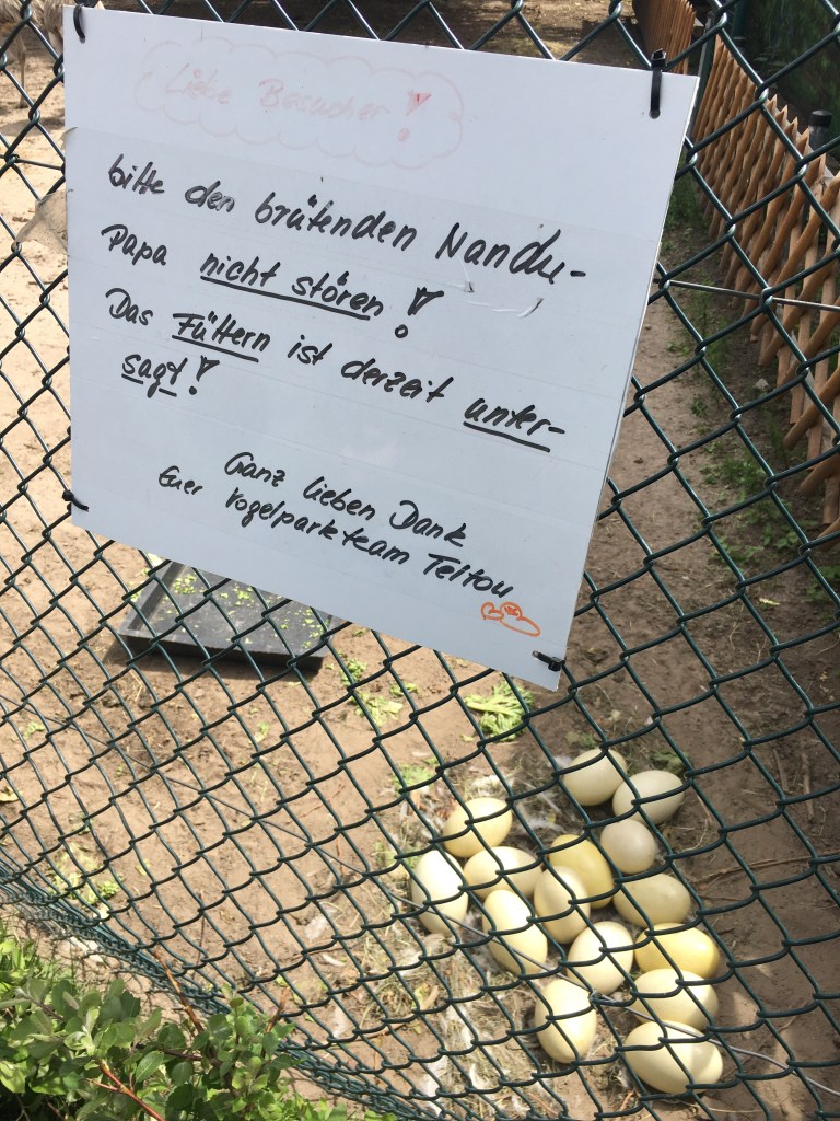 Zwoenitzer~commonswiki Im Streichelzoo schiebt ein zotteliger grauer Riesenvogel mit seinem Schnabel sorgfältig fünfzehn mangogroße Eier in einem rudimentären Nest zusammen, ehe er seinen wuchtigen Vogelkörper langsam absenkt, die Sitzposition wackelnd nachjustiert und schließlich die zu nahe gekommenen Menschengesichter am Zaun fauchend zurechtweist. Der Nandu wünscht offenbar, in Ruhe brüten zu können.