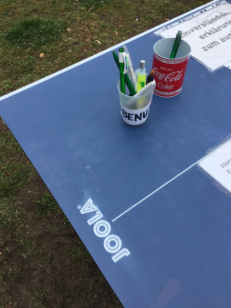 Die erste halbe Tischtennisplatte bildet den offiziellen Startpunkt. Sie ist dekoriert mit einem Coca-Cola-Becher, der genau einen Kuli darbietet, und einem gesonderten Becher mit der Aufschrift „benutzt“, der einen Strauß voller bunt gemischter Stifte enthält. Daneben einige Stapel Vordrucke in Plastikhüllen.