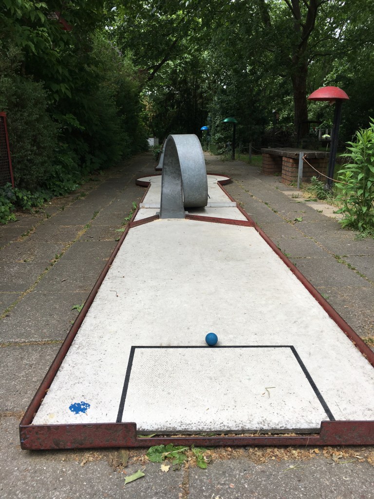 Es ist eine eigene, eine vergessene Welt, die Welt des Minigolfs. Oder auch gar nicht so vergessen: Bei schönem Wetter finden sich plötzlich alle möglichen Leute ein; wie kommen die nur auf die Idee, sonntags Minigolf zu spielen, so ohne Vorschulkind? Gar auch noch Singles und so?