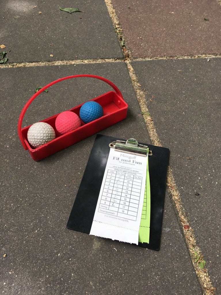 Die erste von den 18 standardisierten Bahnen ist noch einigermaßen machbar, nach und nach steigert sich der Schwierigkeitsgrad. Sechs Schläge höchstens pro Bahn, wenn’s mit denen nicht klappt, muss sich der Forschernachwuchs 7 Punkte auf dem Abrisszettel eintragen. Spiegelverkehrte Ziffer, aber das kann Mama trotzdem lesen. Die Rückseite des Schlägers, das lernt man schnell, hat eine Aussparung, um eingelochte Bälle aus der Ferne wieder zu angeln. Bahnen bloß nicht betreten! Sonst gibt’s Ärger.