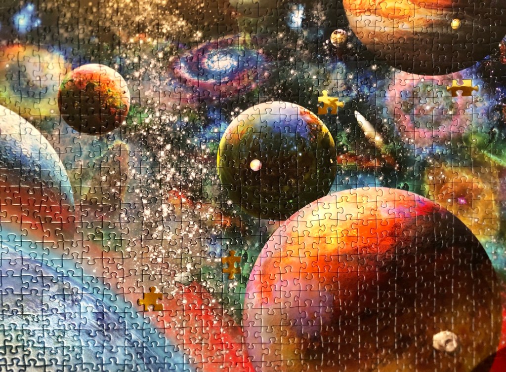 Bemerkenswert ist: die ersten 1000er-Puzzles waren im Wohltätigkeitsladen gebraucht gekauft worden. Bis zu den letzten Teilen war das immer ein kleiner Nervenkitzel, doch alle waren am Ende vollständig. Das aktuelle Puzzle ist nagelneu, vom örtlichen Spielwarenladen. Und jetzt fehlen vier Teile… selbst im aufgeschnittenen Staubsaugerbeutel war keines davon zu finden.